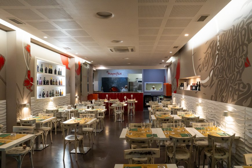 L'ambiente è moderno e accogliente, con forno a vista, murales a tema botanical e una chiara vocazione green. L'attenzione all'ambiente e alla sostenibilità è reale, come certifica l'essere da sempre un locale plastic free. Coerentemente con la sua attenzione al dettaglio, Magnifica è stata una delle prime pizzerie a Roma a dare grande importanza alle birre artigianali, collezionando oltre 40 etichette differenti in tutti questi anni di attività.