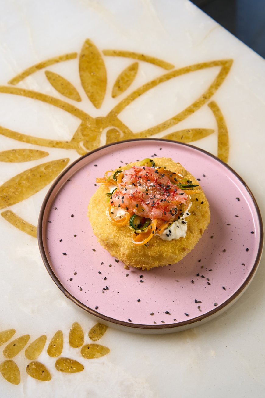Il menu è costruito come un viaggio. Si parte dagli antipasti, piccole creazioni che giocano con l'impasto in chiave diversa: c'è la montanara orientale, dove la tradizione partenopea incontra gamberi e salsa hoisin, o la tacos pizza, che trasforma la pizza fritta in un boccone street-food.