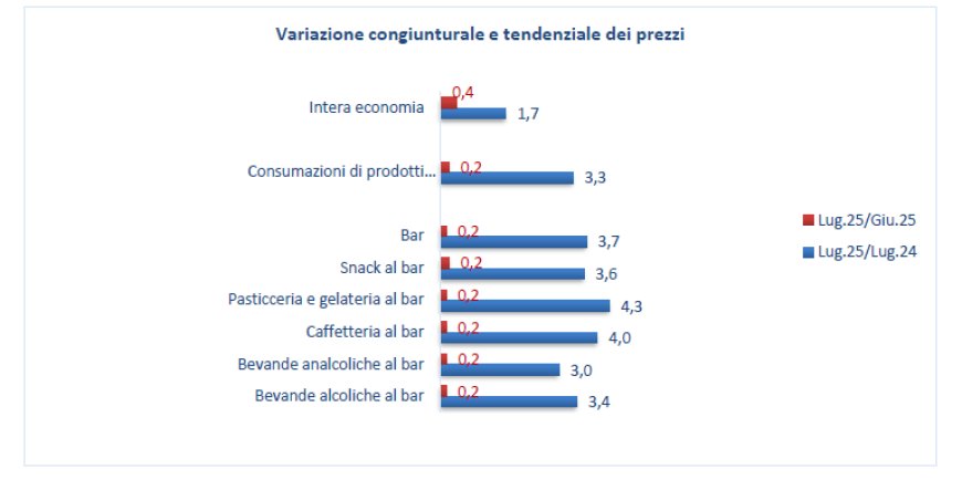 La variazione tendenziale dei prezzi del Bar si attesta a luglio 2025 ancora a +3,7%. Le variazioni tendenziali sopra la media riguardano i prodotti di gelateria e pasticceria (+4,3%) e la caffetteria (+4,0%).