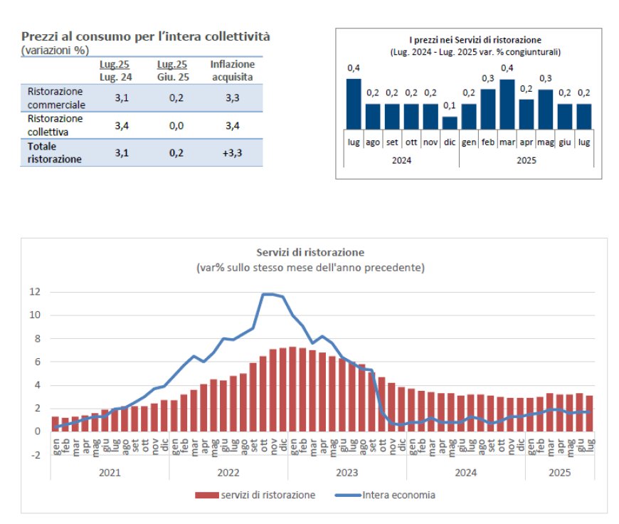 I prezzi nei servizi di ristorazione rallentano a luglio 2025, con inflazione in calo al +3,1%. Quella generale resta stabile all'1,7%.