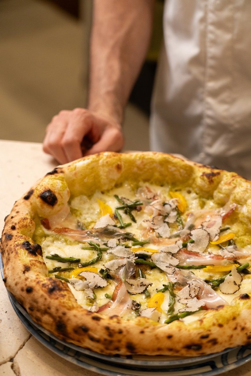 Gli ingredienti della pizza "Quasi Cracco" parlano da soli: crema di asparagi al burro, asparagi selvatici saltati, fior di latte misto bufala, pancetta tesa, tartufo nero estivo, timo limonato e, naturalmente, tuorlo d’uovo marinato. “È una combinazione pensata per essere armonica ma non prevedibile – aggiunge Riemma – con sapori che si intrecciano e si completano, senza mai sovrastarsi”.