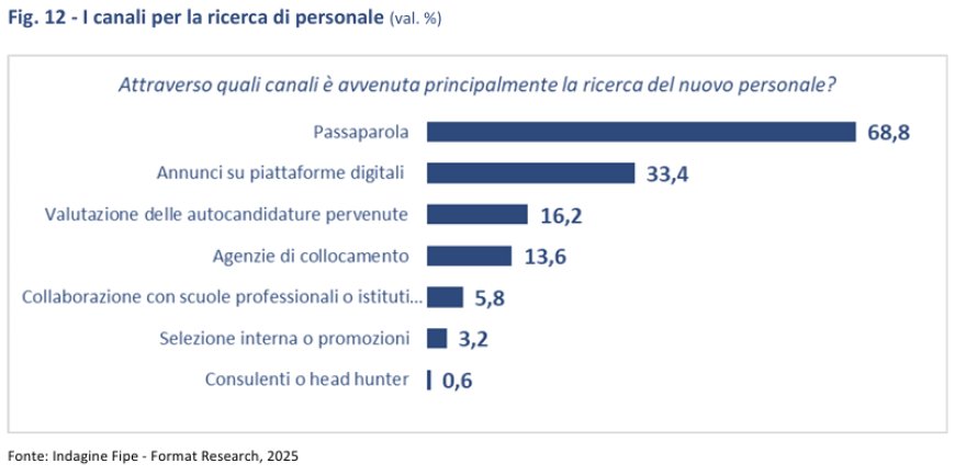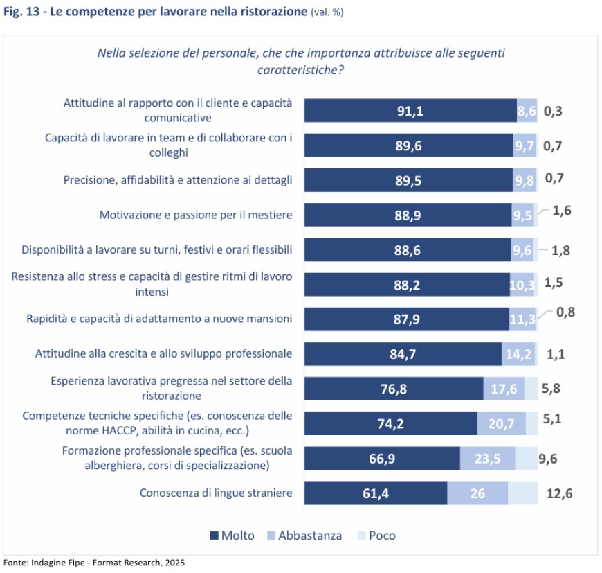Solo il 5,8% sfrutta le sinergie con il mondo della formazione, mentre il 70% utilizza il passaparola. Per gli imprenditori, le competenze più importanti sono capacità comunicative (91,1%), spirito di squadra (89,6%), precisione (89,5%) e passione per il mestiere (88,9%), seguite da esperienza nel settore (76,8%) e competenze tecniche specifiche (74,2%).