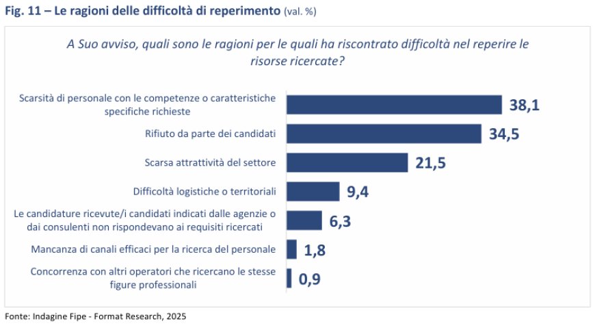 Le principali ragioni sono la scarsità di personale con competenze adeguate (38,1%) e il rifiuto da parte dei candidati (34,5%), mentre il 21,5% indica una scarsa attrattività del settore.
