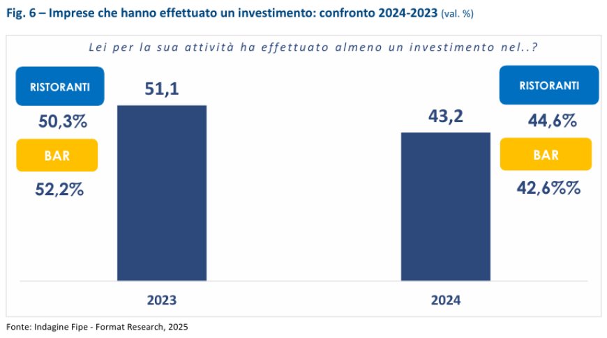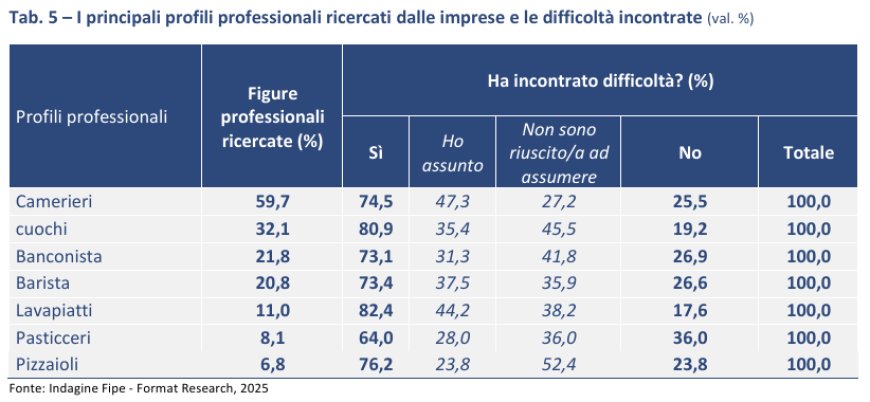 Il 23,1% delle imprese rileva difficoltà legate alla dotazione organica. Il 35,6% ha cercato o assunto nuovo personale nell'ultimo anno, e il 90,2% di queste ha incontrato difficoltà nel reperire figure come banconisti, cuochi, camerieri e lavapiatti.