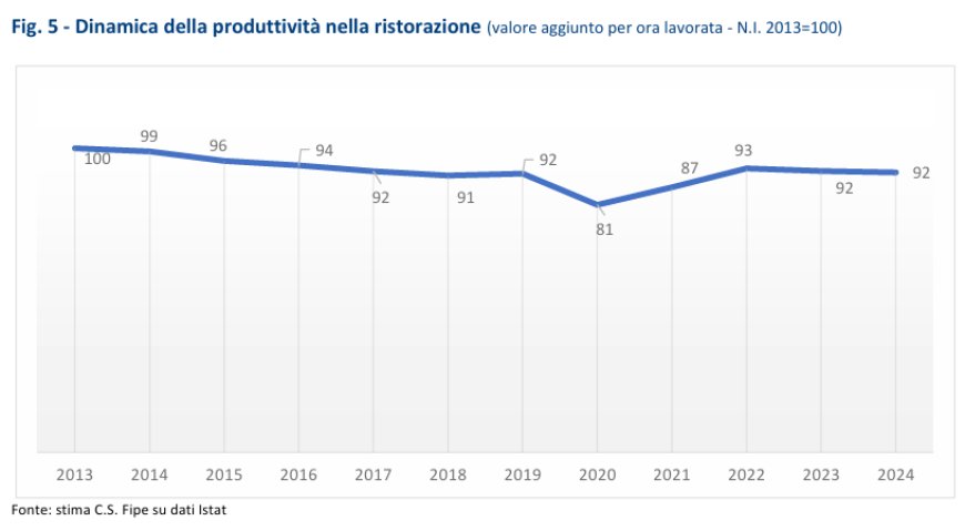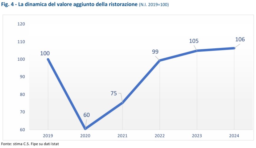 Gli indicatori economici confermano il sentiment positivo. Il valore aggiunto dei servizi di ristorazione nel 2024 è stimato in 59,3 miliardi di euro, con una crescita reale dell'1,4% sul 2023 e del 6,3% rispetto al 2019. Persistono problemi di produttività, influenzata dall'intenso impiego di manodopera e dalla struttura basata su micro e piccole imprese.