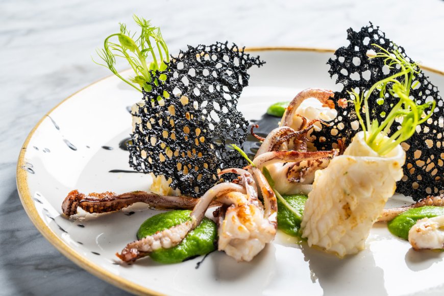 Anche il ristorante Gli Affreschi, così chiamato perché qui durante la ristrutturazione sono stati scoperti affreschi che alcuni esperti dicono riferirsi alla battaglia di Montaperti del 1260, è pronto ad accogliere di nuovo gli ospiti. Per il 2025 potrà contare su qualche tavolo in più ma continuando a mantenere l'intimità dell'ambiente: il bancone bar, infatti, è stato spostato verso la terrazza, creando un contatto diretto con la zona esterna. Qui lo chef Ricci può esprimere tutto il suo talento e tutta la sua conoscenza del prodotto, proponendo una raffinata cucina di livello ma fortemente legata la tradizione toscana, rivisitata e alleggerita con tecniche moderne con l'obiettivo primario di esaltare la materia prima, da provare ordinando alla carta o lasciandosi guidare con i due menu degustazione di quattro portate: uno di terra "Sapori Toscani" e uno di pesce "Dal Mare". Il percorso di pesce, sebbene più insolito per l'entroterra toscano, riscuote il consenso degli ospiti, consolidando piatti come il Calamaro arrosto su crema di piselli e il suo inchiostro.