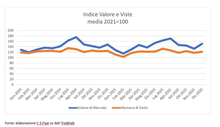 Fin dai primi mesi dell'anno emerge però una differenza di intensità tra i due indicatori: il valore di mercato cresce in modo più deciso rispetto alle visite.