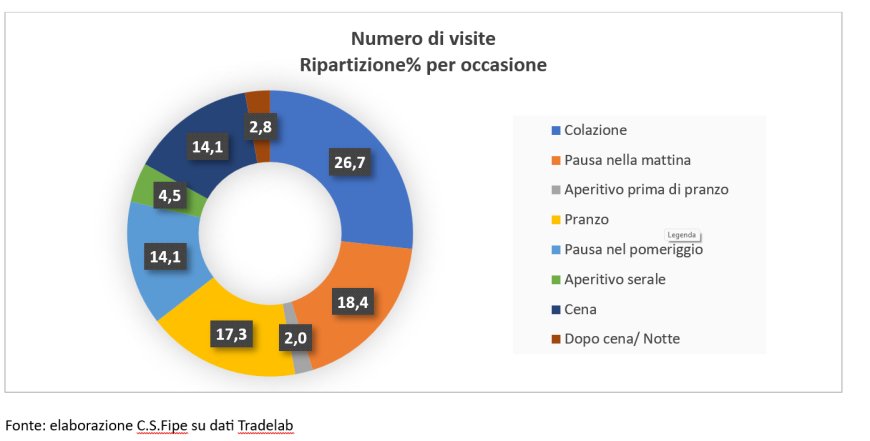 Nel 2025 la distribuzione percentuale visite per occasione di consumo vede il primato della colazione che si conferma per importanza nei comportamenti degli italiani. Seguono la pausa della mattina e il pranzo che arriva a superare, anche se di poco, la cena.