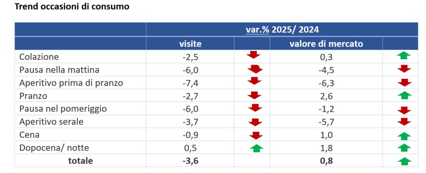 INDAGINI E RICERCHE - I consumi fuori casa nel 2025 attraversano una fase di rallentamento caratterizzata da comportamenti più selettivi: le visite nei pubblici esercizi diminuiscono del 3,6%, mentre la spesa registra una lieve crescita dello 0,8%. Emerge un nuovo pattern di consumo in cui gli italiani escono meno frequentemente ma spendono leggermente di più quando lo fanno. La colazione si conferma l'occasione di consumo principale, mentre ristoranti e catene fast food dimostrano maggiore resilienza rispetto a bar e asporto. È quanto emerge dall'analisi sui consumi fuori casa elaborata da Fipe-Confcommercio.