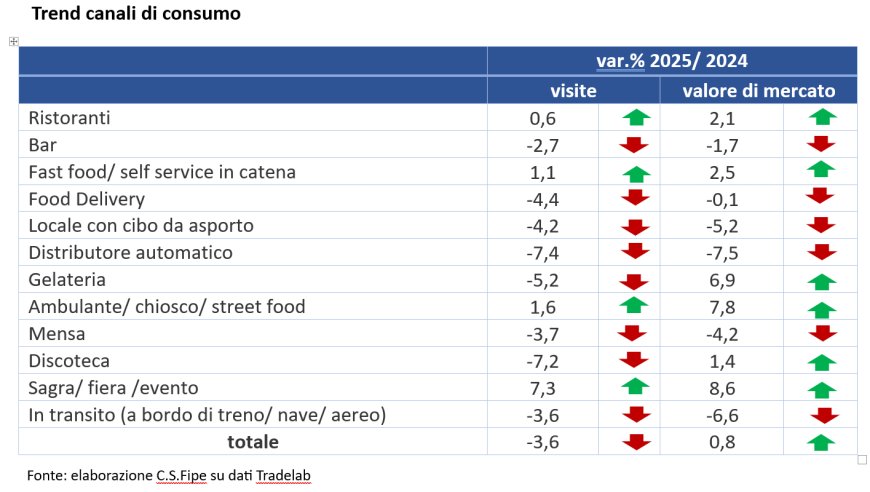 Lo studio Fipe sui consumi fuori casa evidenzia un -3,6% nelle visite contro un +0,8% nella spesa.