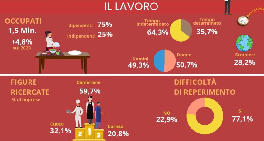 Il 2024 ha visto consolidarsi ulteriormente il trend positivo dell'occupazione nel settore. I dati mostrano 1,5 milioni di occupati in bar, ristoranti, aziende di banqueting e mense, di cui oltre 1,1 milioni sono lavoratori dipendenti. Rispetto al 2023, si registra un incremento complessivo di circa cinque punti percentuali, mentre i lavoratori dipendenti sono cresciuti del 6,7%, equivalente a 70mila unità in più in valore assoluto.