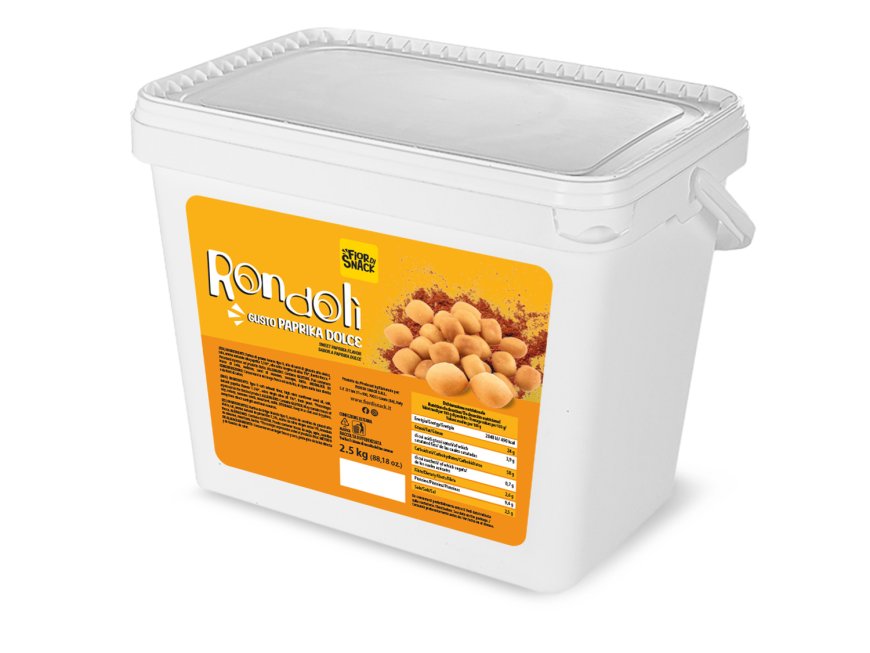 Il gusto Paprika Dolce unisce fragranza e carattere: la paprika dal profilo dolce e sottilmente affumicato conferisce ai Rondolì una connotazione calda e distintiva. Si prestano all'accompagnamento con preparazioni cremose, affettati o come proposta originale da condividere in compagnia. Disponibile in secchiello da 2,5 kg.