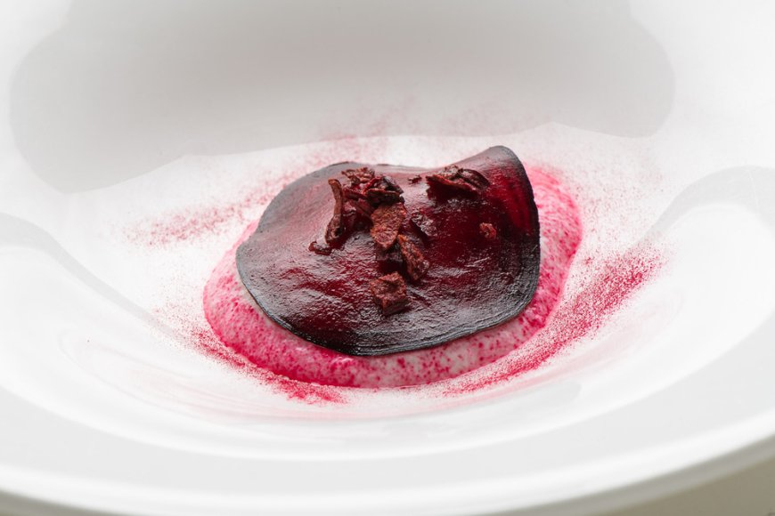 Per la rapa rossa: Cuocere in forno la rapa rossa con la buccia a 170 °C per 3 ore circa. Pelarla e congelarla. Tagliarla all’affettatrice sottile prima di adagiarla nel piatto e tamponarla delicatamente con carta da cucina. Per la polvere essiccare in forno la rapa cruda tagliata a fette 55°C per 10/12 ore. Polverizzare. Per la chips tagliare a fette sottili la rapa cruda e friggerla in olio di semi a 140 °C