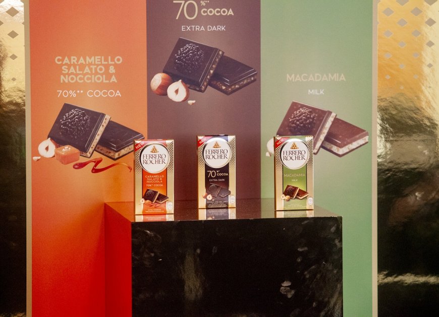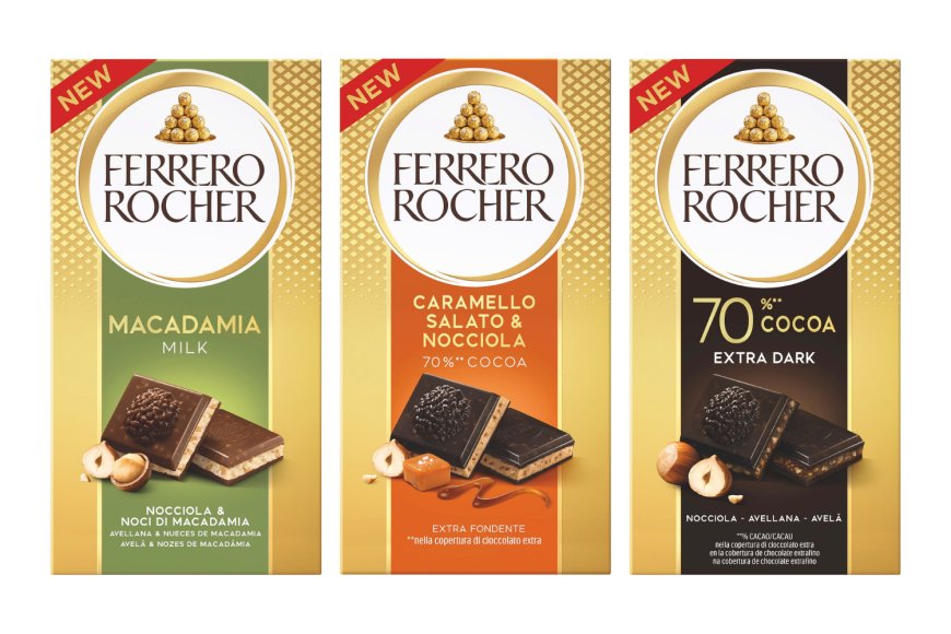 Infine, sono state svelate tre nuove varianti di tavolette a marchio FERRERO ROCHER: Fondente 70%, Caramello Salato e Nocciola, Noci di Macadamia e Nocciola.