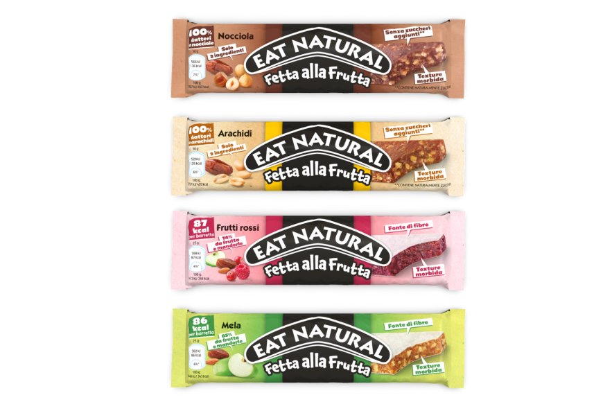 Nel comparto delle barrette proteiche e a base di frutta e cereali, è stata ufficialmente presentata EAT NATURAL FETTA ALLA FRUTTA, una gamma di barrette soffici alla frutta caratterizzata da una composizione essenziale, che arriva a contenere appena due ingredienti nelle versioni arachidi e nocciole. Le barrette EAT NATURAL FETTA ALLA FRUTTA sono prodotte con componenti di origine naturale, quali datteri, mele, mirtilli rossi, nocciole, mandorle e arachidi.