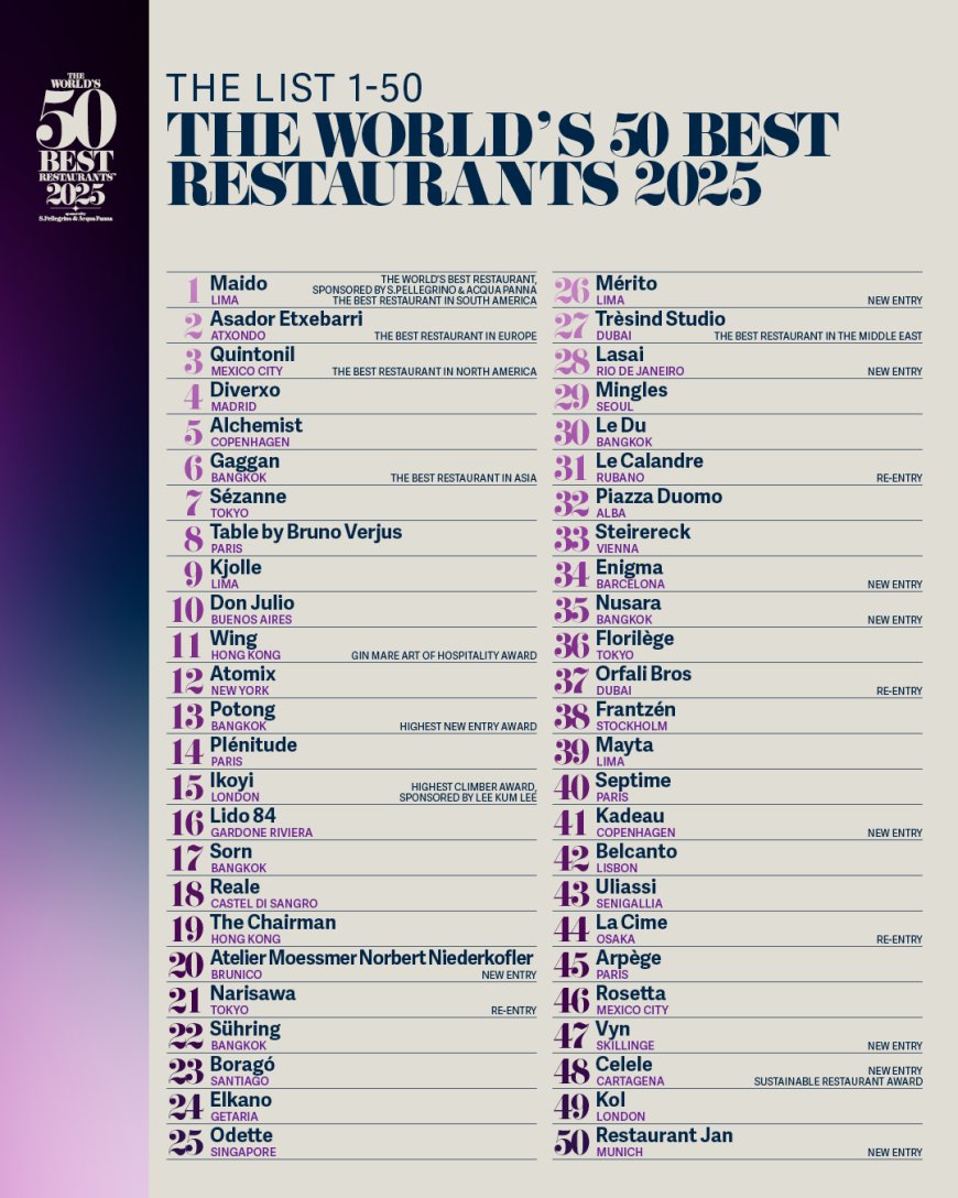 Il ristorante Maido a Lima, in Peru, è il The World’s 50 Best Restaurants 2025. La classifica include ristoranti provenienti da 22 regioni in cinque continenti.