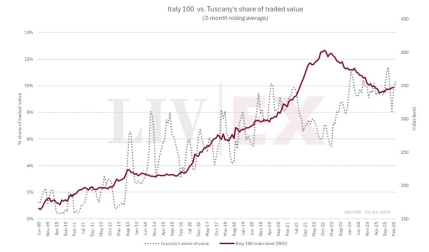 BUSINESS & MERCATO - Nel pieno di una fase di contrazione che da oltre tre anni attraversa il mercato globale dei fine wines, la Toscana si muove in controtendenza solo in apparenza. I dati più recenti diffusi da Liv-ex mostrano infatti un quadro più articolato: non una crescita diffusa, ma una tenuta selettiva, che si costruisce attraverso una progressiva concentrazione del valore.