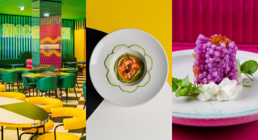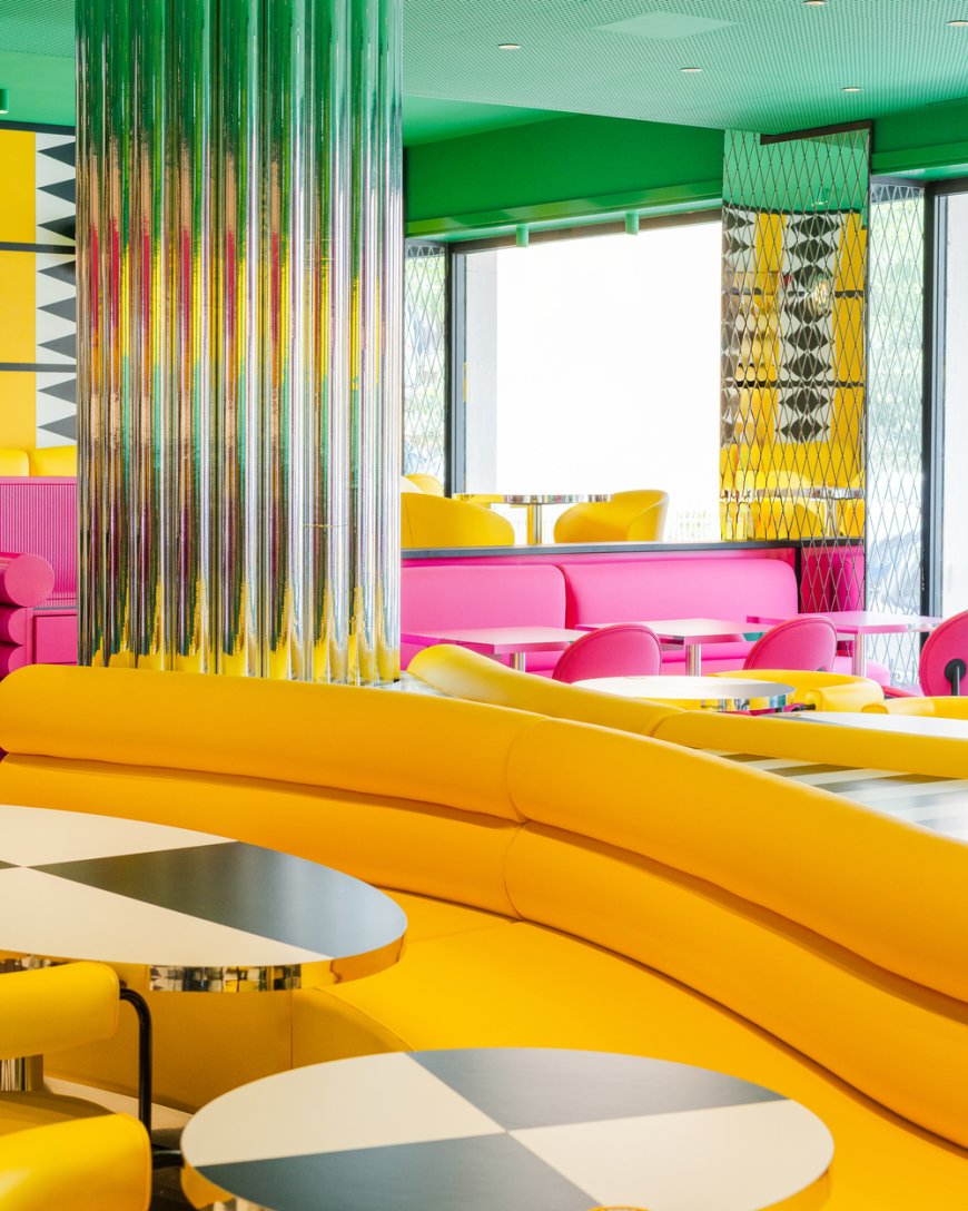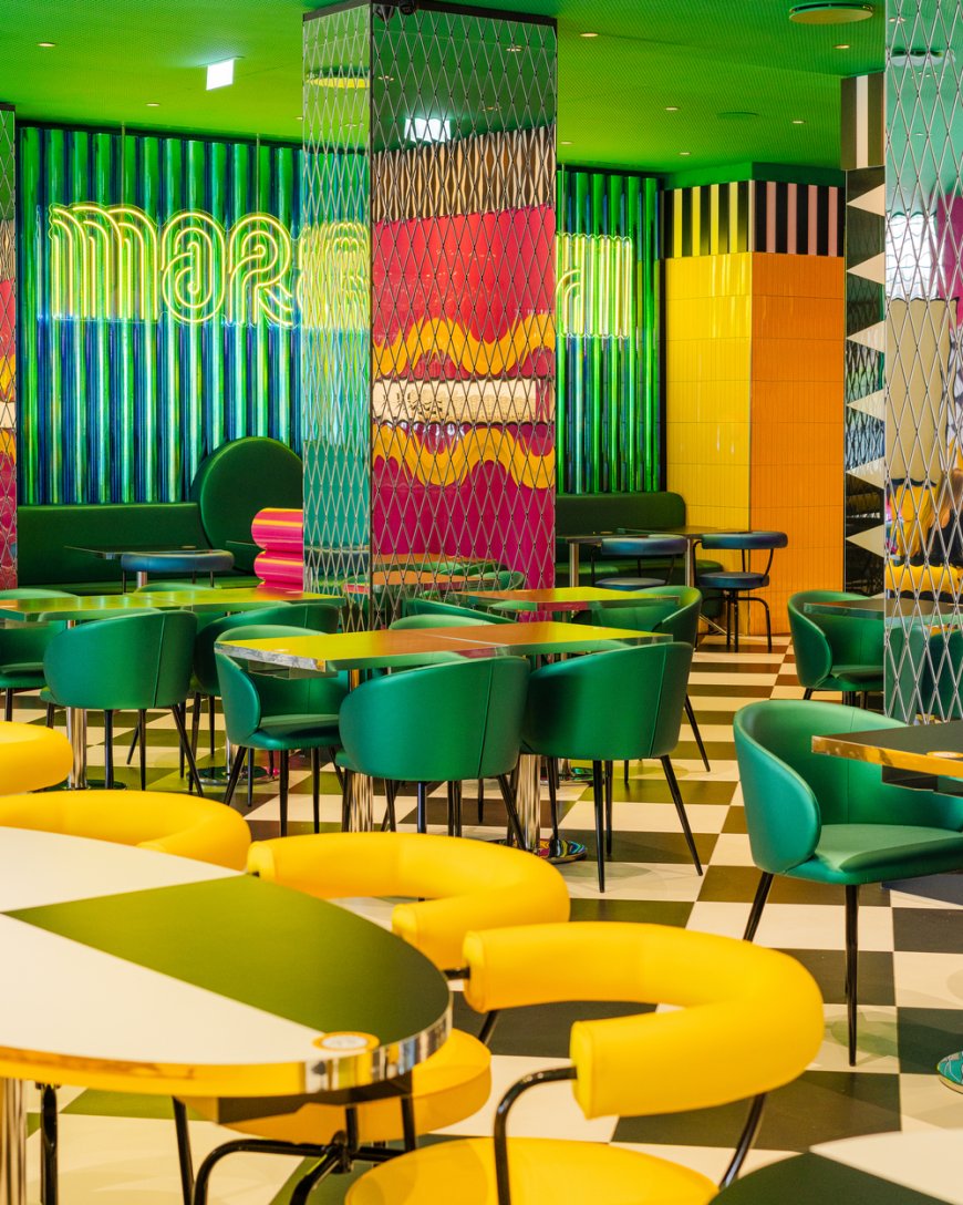 L'interior design presenta pavimenti a scacchi, insegne al neon, arredi dalle linee bold, texture tattili e palette cromatiche vivaci, creando un'atmosfera ottimista e coinvolgente all'insegna delle positive vibes. Lo spazio è progettato come scenografia dell'esperienza, dove ogni elemento è studiato per stimolare i sensi e generare sorpresa nel cliente.