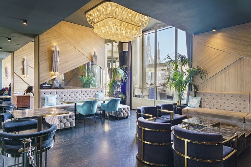 Il fascino del locale è inconfondibile. Alti soffitti e affreschi d'epoca convivono con arredi di design contemporaneo e raffinati giochi di specchi, creando un'estetica capace di sorprendere a ogni visita. Gli ambienti si aprono infine sulla terrazza, dove lo sguardo spazia liberamente su Piazza del Duomo e sulla magnifica Galleria Vittorio Emanuele II.