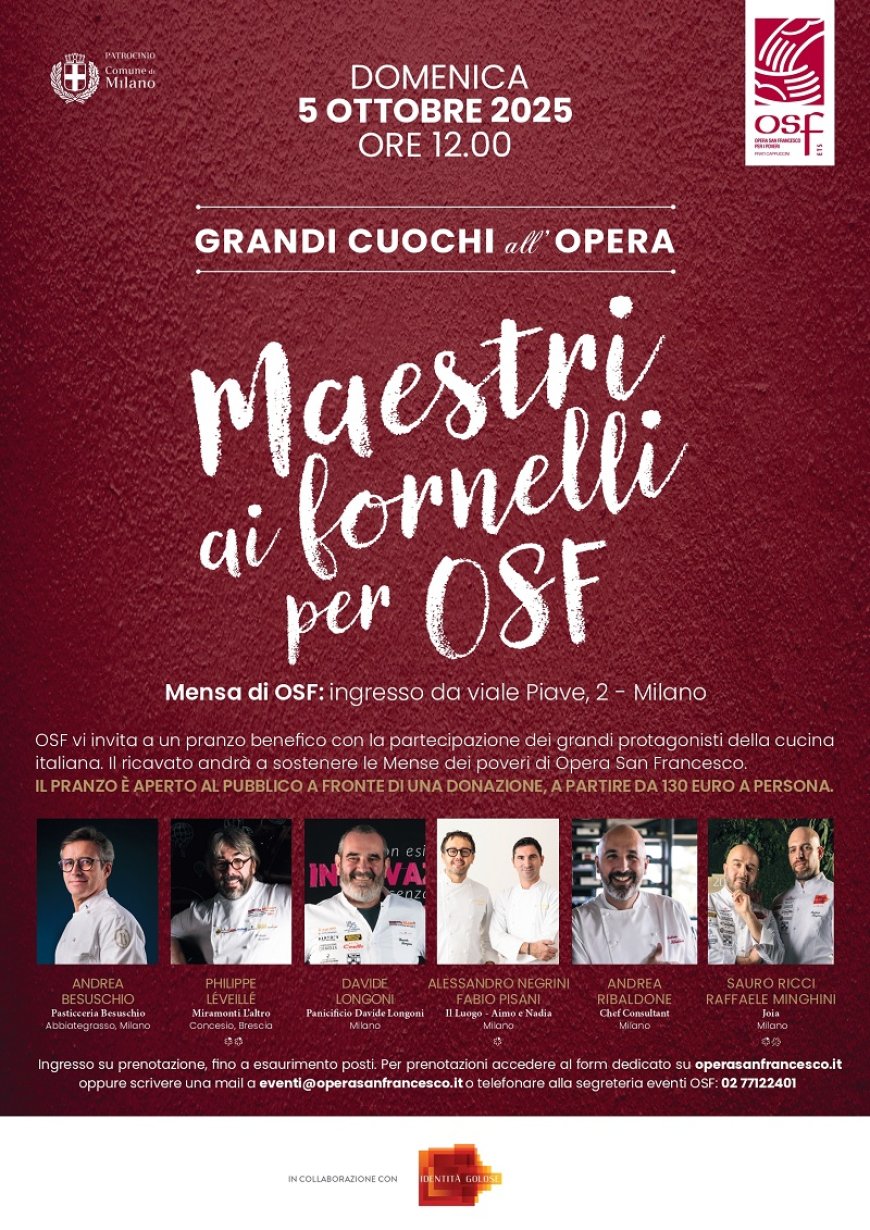 Tra le iniziative più attese spicca il ritorno di Grandi Cuochi all’Opera, evento giunto alla sua quattordicesima edizione e organizzato in collaborazione con Identità Golose. L’appuntamento si terrà domenica 5 ottobre nella storica mensa di corso Concordia, che per l’occasione aprirà le porte al pubblico. Qui alcuni tra i più noti protagonisti della cucina italiana indosseranno la giacca da chef per sostenere OSF, preparando un pranzo benefico speciale.