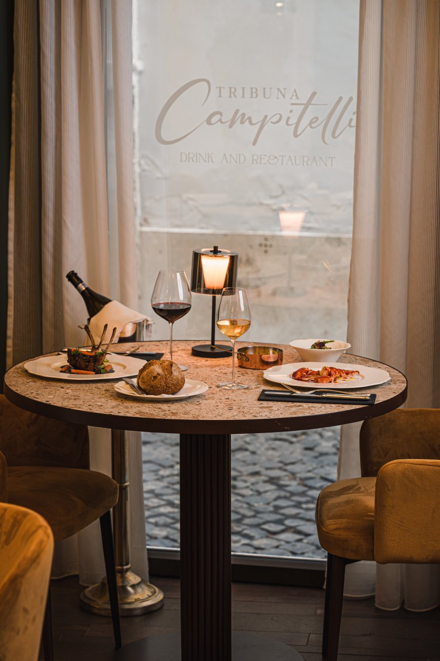 Tribuna Campitelli conta circa 80 coperti distribuiti tra il dehor affacciato sulla piazzetta e gli ambienti interni, dove alcune sale possono essere privatizzate per esperienze su misura.