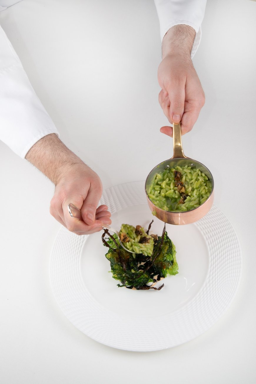 Per questa occasione speciale, Russo ha impiegato l'extravergine "Amare" del Frantoio di Sant'Agata d'Oneglia e ha sostituito i risoni che normalmente adopera con i ditalini al kamut firmati Monograno Felicetti.