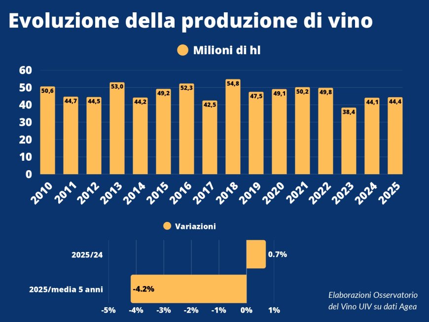 BUSINESS & MERCATO - La produzione vinicola dell'ultima vendemmia ammonta a 44,383 milioni di ettolitri, secondo quanto comunicato oggi dall'Italia alla Commissione europea. Contrariamente alle previsioni, rileva Unione italiana vini (UIV), la produzione 2025 risulta sostanzialmente in linea con l'anno precedente (+0,7%) grazie soprattutto a un'oculata riduzione delle rese delle principali denominazioni italiane, più che per eventi climatici avversi. Un contingentamento produttivo, attuato nei territori per mantenere in equilibrio la filiera, che però – secondo UIV – non è stato sufficiente se si considera l'attuale livello di giacenze.
