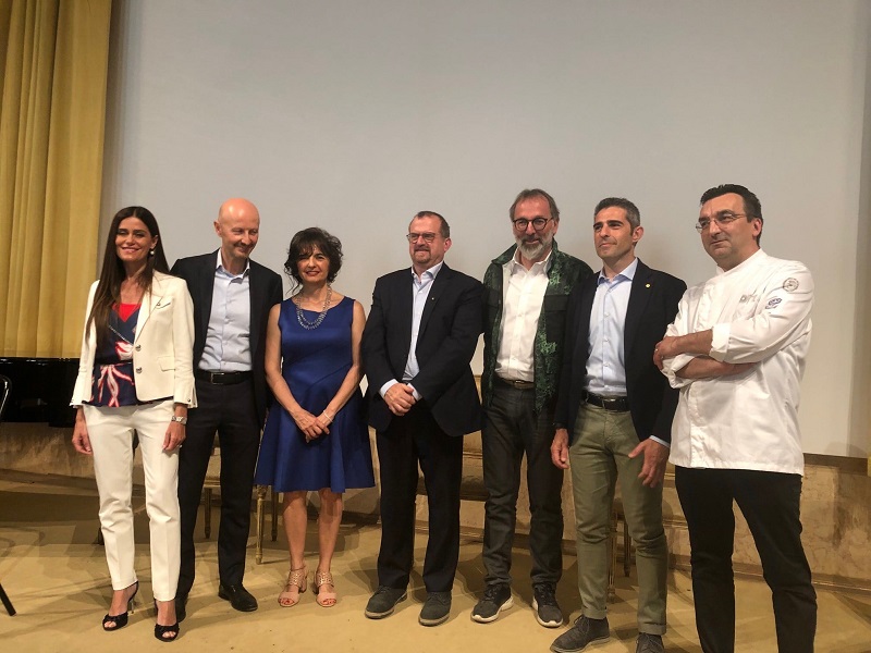 Da sinistra: la presentatrice Francesca Strozzi, l'assessore al Turismo del Comune di Parma Cristiano Casa, la Presidente di Destinazione Turistica Emilia Natalia Maramotti, lo Chef Massimo Spigaroli (presidente della Fondazione Parma UNESCO Creative City of Gastronomy), lo Chef Norbert Niederkofler, il Sindaco di Parma Federico Pizzarotti, lo chef Enrico Bergonzi per Parma Quality Restaurants[/caption]
