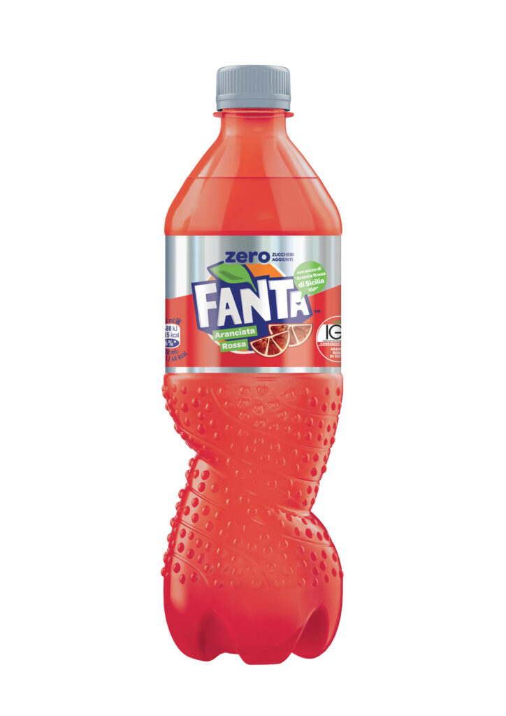 Fanta Aranciata Rossa Zero Zuccheri Aggiunti con “Succo di Arancia Rossa di Sicilia IGP” è disponibile nei formati PET 66 cl e 1 L, 100% riciclabili.
