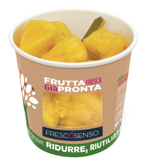 Fresco Senso, brand di Agribologna, rilancia referenze alto vendenti come ananas e macedonia e propone il bicchiere di carta per la frutta di IV Gamma.
