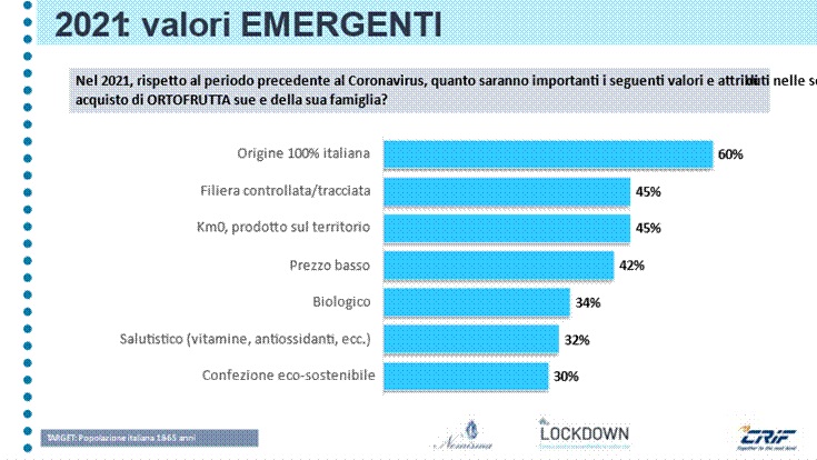 Per il 60% dei responsabili acquisti l’origine 100% italiana acquisirà ulteriore centralità nelle scelte scelta di frutta e verdura. Ne è conferma l’elevata importanza attribuita ai prodotti ortofrutticoli a km zero o del territorio (45%). Anche la ricerca di adeguate garanzie di controllo e rintracciabilità lungo la filiera genera interesse (45%). Tra gli altri valori determinanti, ci sono i prodotti biologici (34%) e salutistici (32%), con un occhio anche alla sostenibilità, grazie alle confezioni in materiali riciclabili o ecosostenibili (30%).