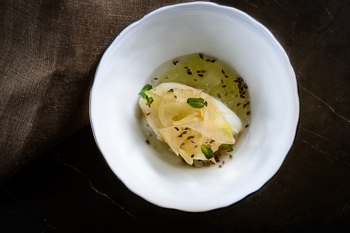 Al tempo stesso ingredienti classici vengono interpretati in chiave insolita: così tra i dessert troviamo i finocchi canditi alla menta con crema gelata alle pere, melone bianco e semi di anice (2012) e la coppa di gelatina di birra belga doppio malto, gocce di cioccolato puro e chantilly alla cannella (2003).FOOO_finocchi canditi alla menta con crema gelata alle pere, melone binaco e anice